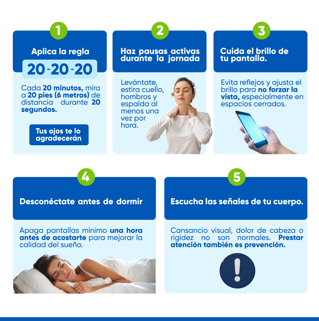 Uno de los más frecuentes es el síndrome visual informático, que se manifiesta con resequedad ocular, visión borrosa, dolor de cabeza o sensación de cansancio en los ojos. Estas señales son una alerta de que necesitamos ajustar hábitos sencillos, como regular el brillo de la pantalla, parpadear con mayor frecuencia y mantener una distancia adecuada entre los ojos y el computador. Por eso, te compartimos 5 tips para prevenir y cuidar tu salud visual: